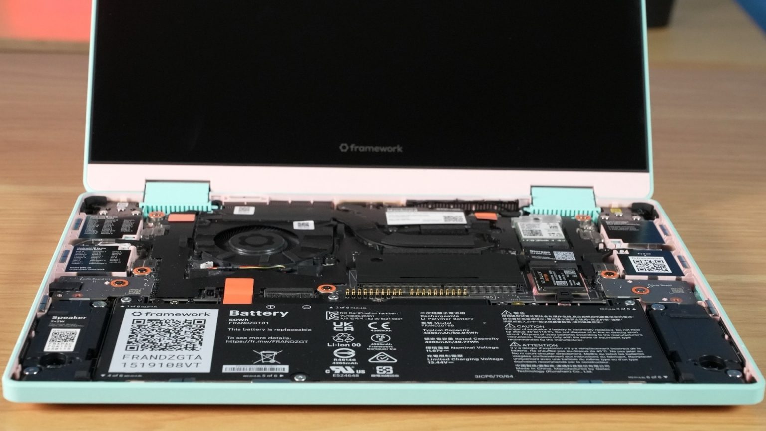 Avec le Framework Laptop 12, le fabricant pousse à son paroxysme le concept de “do it yourself”. L’assemblage ne nécessite aucun tournevis pour l’installation du SSD et de la RAM : un simple mécanisme à levettes fixe solidement les modules à la carte mère. La coque arrière se referme ensuite sur huit vis Torx “captive” qui ne risquent pas de se perdre. En moins de 15 minutes, de la boîte au démarrage, on dispose d’un ordinateur fonctionnel, sans système d’exploitation imposé. Cette approche ravira les amateurs de bidouille, mais aussi tous ceux qui veulent prolonger la durée de vie de leur machine à moindre coût.